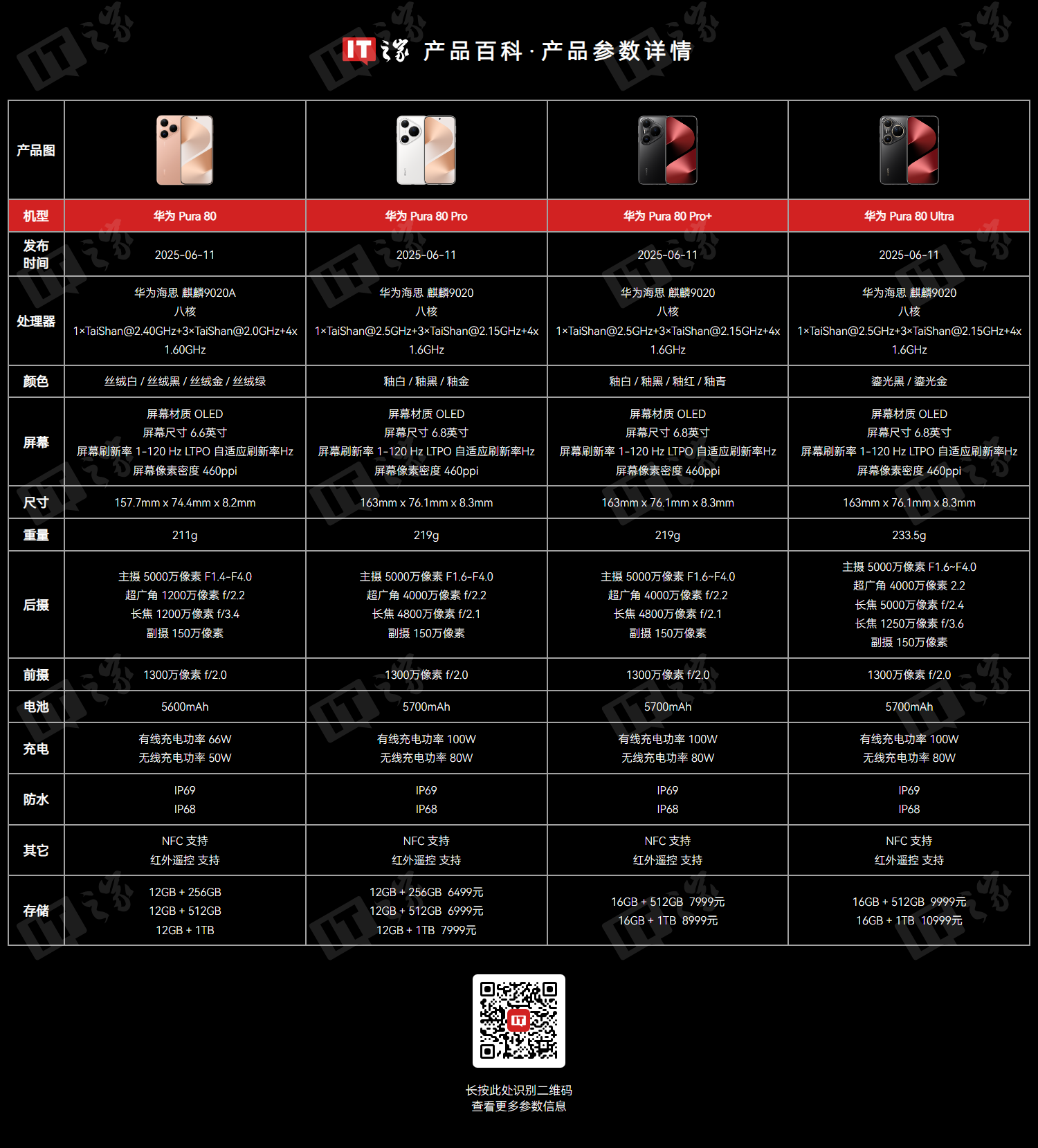 华为 Pura 80 系列手机于 6 月 11 日在国内发布,新机包含 Pura 80、Pura 80 Pro、Pura 80 Pro+ 和 Pura 80 Ultra 四款,采用耀目风向标家族化家族语言、织纹中框,共有两种屏幕形态,Pura 80 为 6.6 英寸直屏,Pro、Pro + 为 6.8 英寸等深四曲面屏。IT之家附该系列机型主要配置信息如下图: