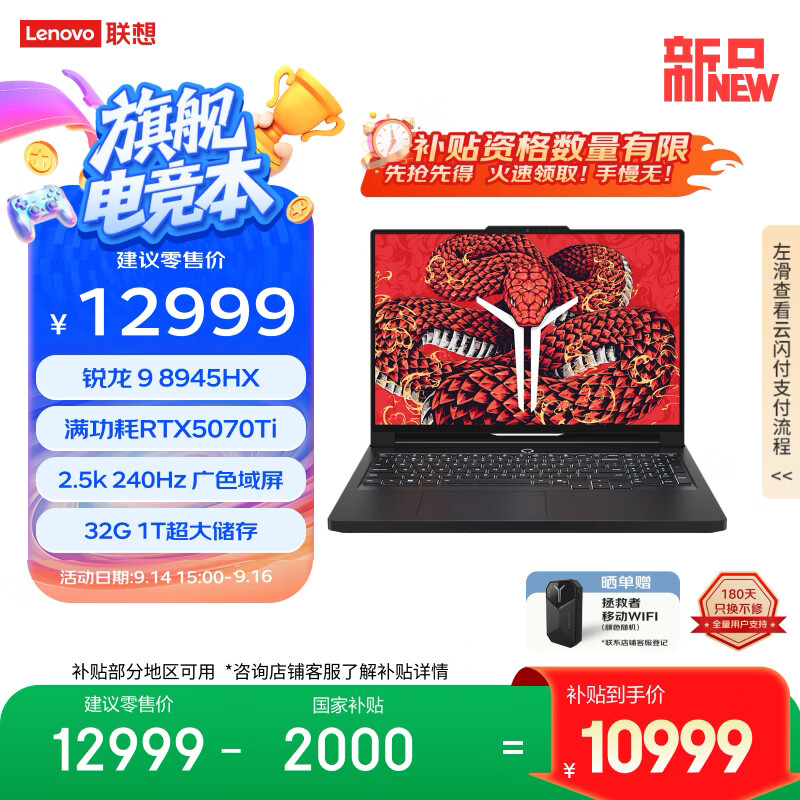 京东联想 拯救者 R9000P 2025 游戏笔记本电脑 8945HX + RTX 5070 Ti12999 元直达链接