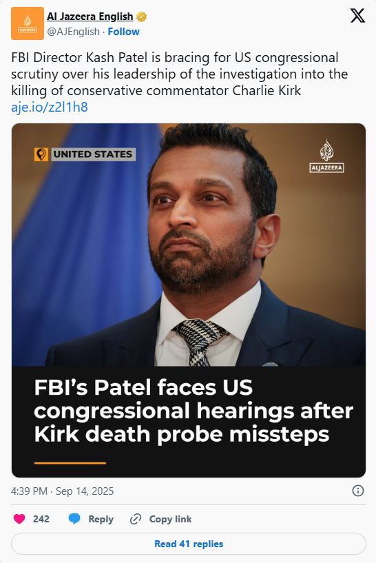 美国联邦调查局局长卡什·帕特尔正准备面对国会对他在调查柯克遇害案中的处理方式的严厉审查。国会议员可能会就他早期的失误向他施压,其中包括一条现已纠正的社交媒体帖子,该帖子错误地声称一名嫌疑人已被拘留。
