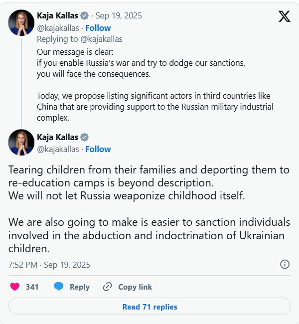卡拉斯在社交媒体上发帖称:“将孩子从家人身边带走,并将他们遣送到再教育营,这种行为难以言表。我们不会允许俄罗斯将儿童本身变成武器。”