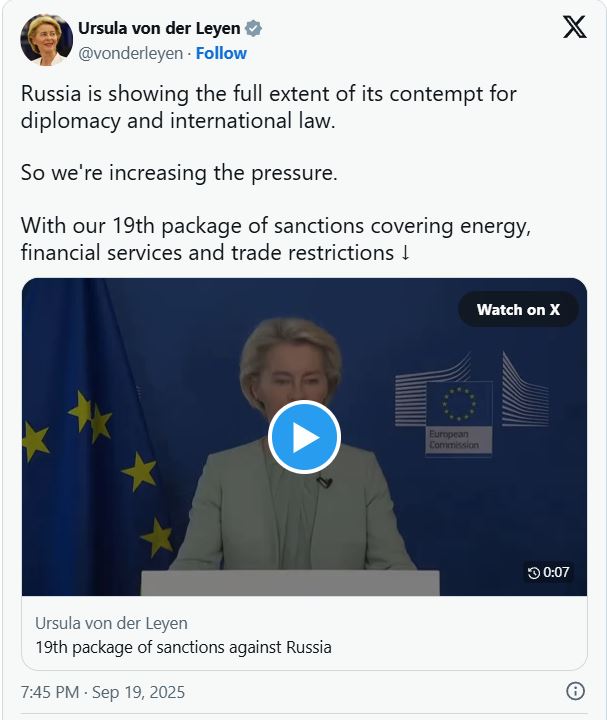 欧盟委员会主席乌尔苏拉·冯德莱恩提出了针对俄罗斯的第19轮制裁措施,敦促欧盟成员国对俄罗斯液化天然气(LNG)出口采取新的制裁措施,以迫使莫斯科结束其在乌克兰的“残酷”战争。