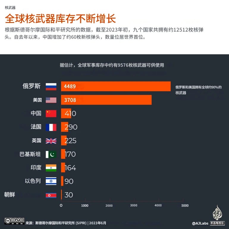 全球核武器库存不断增长 根据斯德哥尔摩国际和平研究所的数据,截至2023年初,九个国家共拥有约12512枚核弹头。自去年以来,中国增加了约60枚新核弹头。