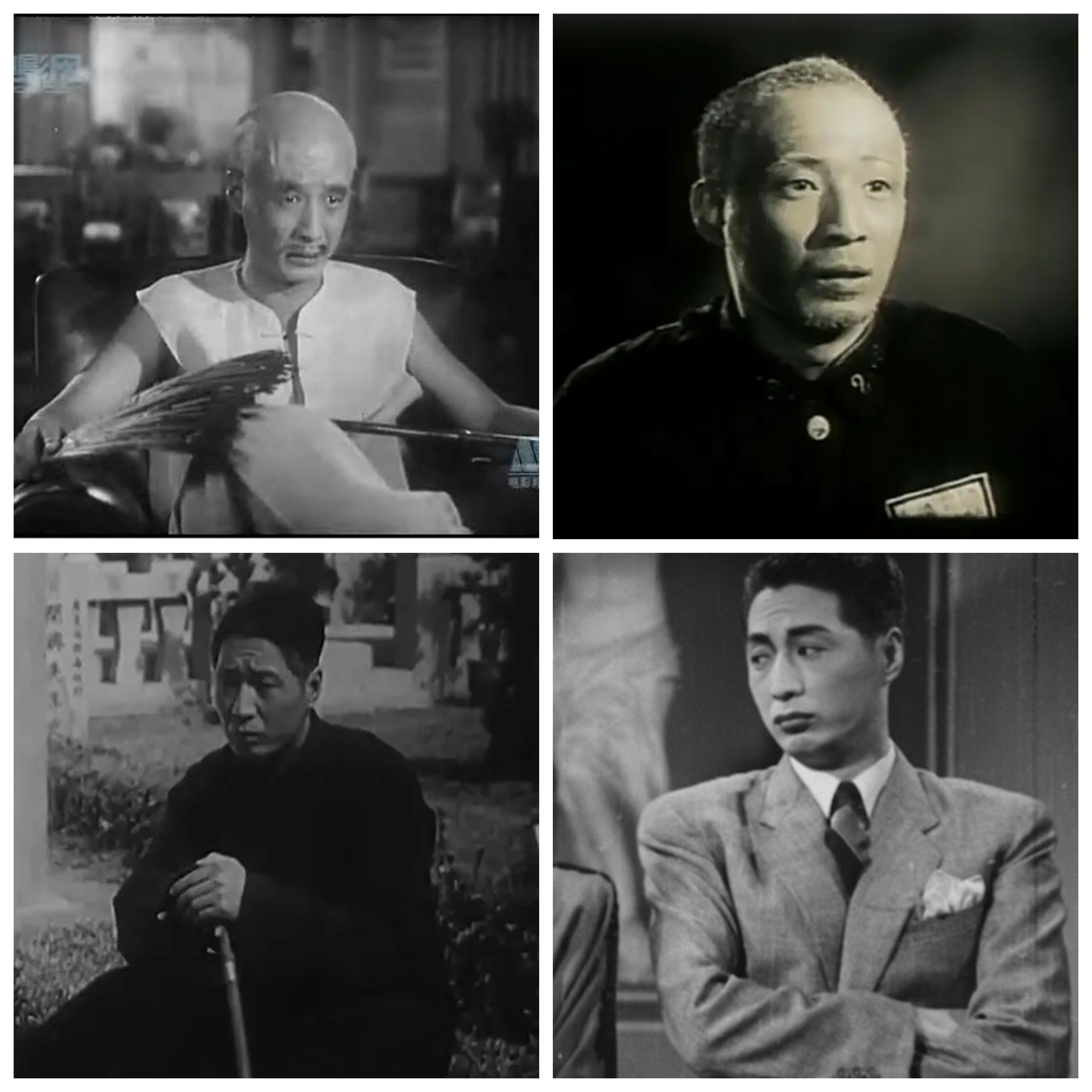 石挥在《太太万岁》(左上)《我这一辈子》(右上)《哀乐中年》(左下)《假凤虚凰》(右下)中的造型