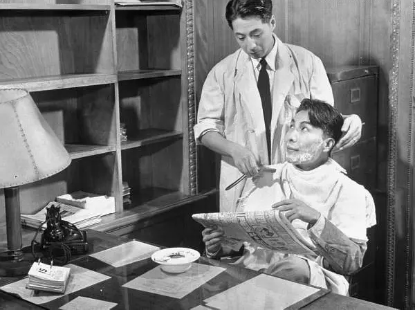 《假凤虚凰》是石挥主演的第一部电影,胡金铨导演老是跟我讲,只要石挥一出来,一定会有很多非常准确又有趣的小细节,我们能看到他努力地捕捉理发匠的说话方式,还加入了特别多的细节和动作,比如顺手把香烟夹在耳朵上,顺手从兜里拿出一把梳子给洋娃娃梳头,拿到餐巾顺手给别人当作理发的围兜系上……这些都不可能由编剧事无巨细地写在剧本里,靠的是演员对于生活的观察和对于人物细致的理解。