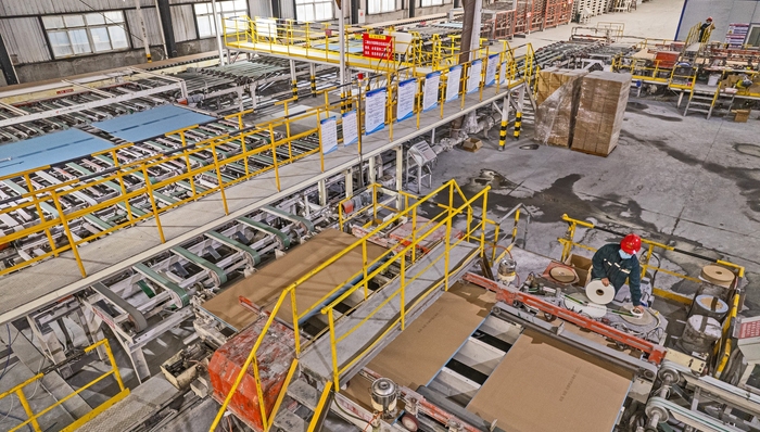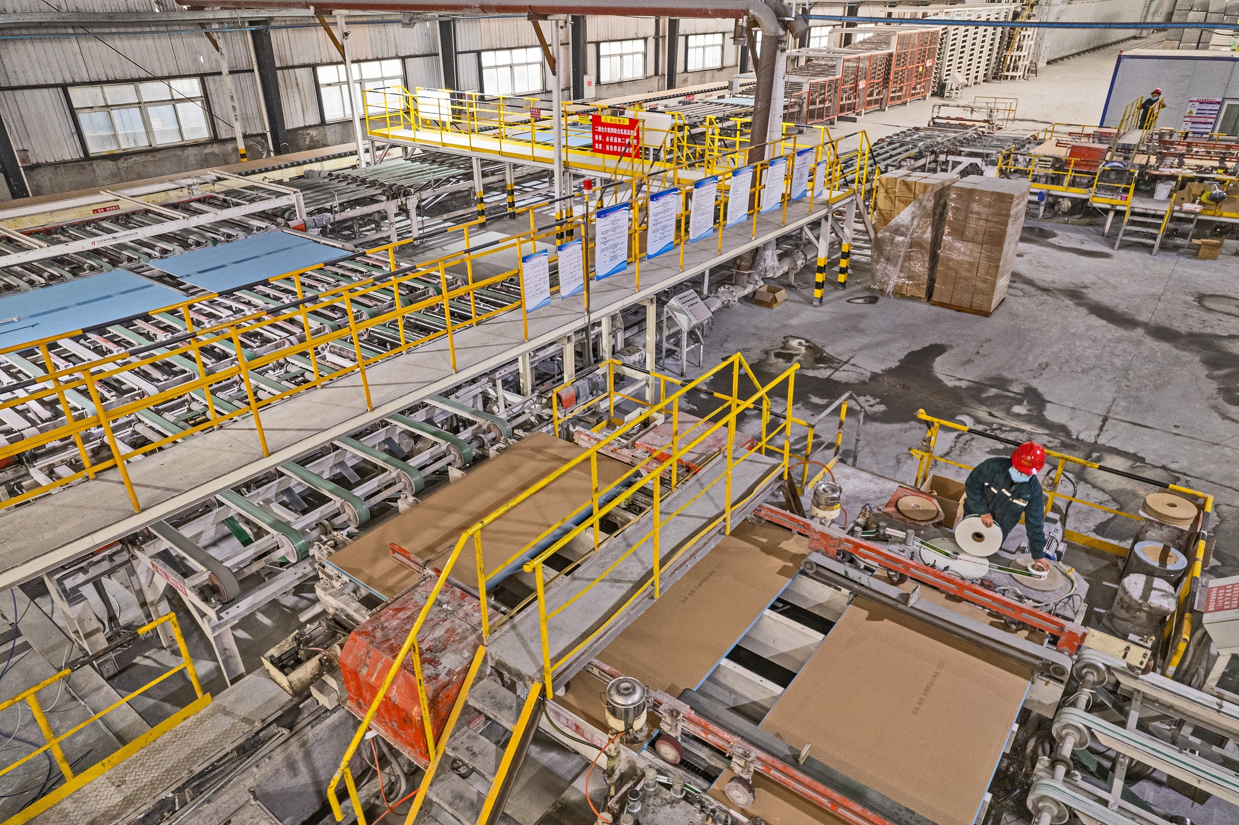 2023年4月3日,在宜都鄂中石膏建材厂车间,一条长达285米的滑床正高速运转,磷石膏浆历经成型、烘干、切断等多道工序后,成为一张张高强度的纸面石膏板。图片来源:CFP