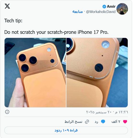 苹果公司强调,iPhone 17 Pro的设计坚固耐用,并通过了其所有严格的内部测试协议。该公司承认,这些划痕可能是由于以不同方式使用手机而导致的正常磨损迹象,并且是由于设备中使用的锋利边缘而产生的正常现象。