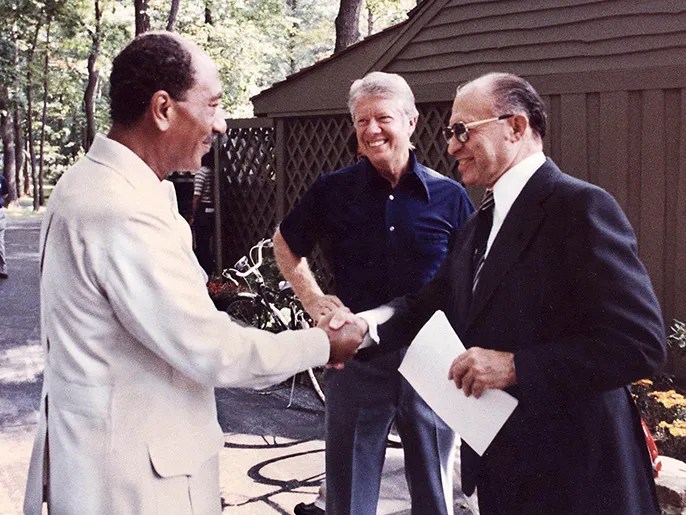 伊农认为贝京(右)和萨达特(左)达成的《戴维营协议》不符合以色列的长期利益(欧洲通讯社)