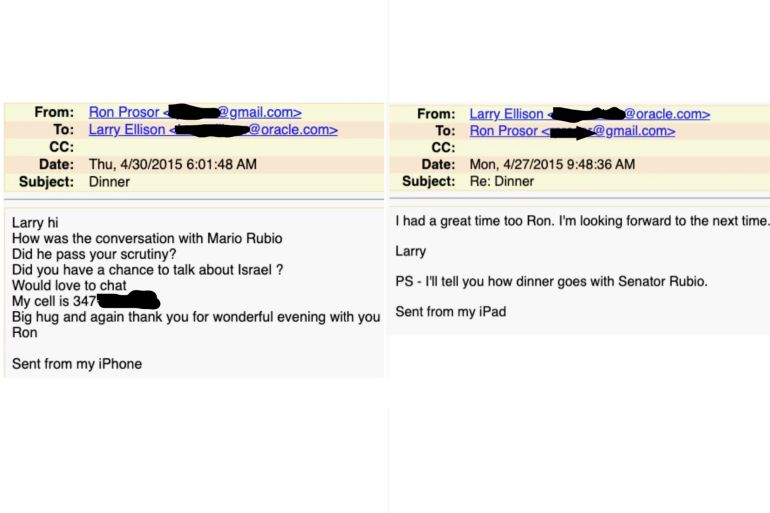 “DropSite”网站披露了一批可追溯至2015年的电子邮件,这些邮件显示了拉里·埃里森与时任以色列驻联合国大使、现任以色列驻德国大使的罗恩·普罗索尔之间持续的对话——讨论内容围绕鲁比奥对以色列政策的立场。