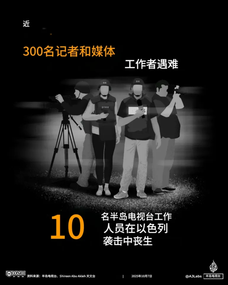 据监测组织“希琳·阿布·阿格莱”报道,自2023年10月7日以来,加沙已有近300名记者和媒体工作者遇难,其中包括10名半岛电视台工作人员。