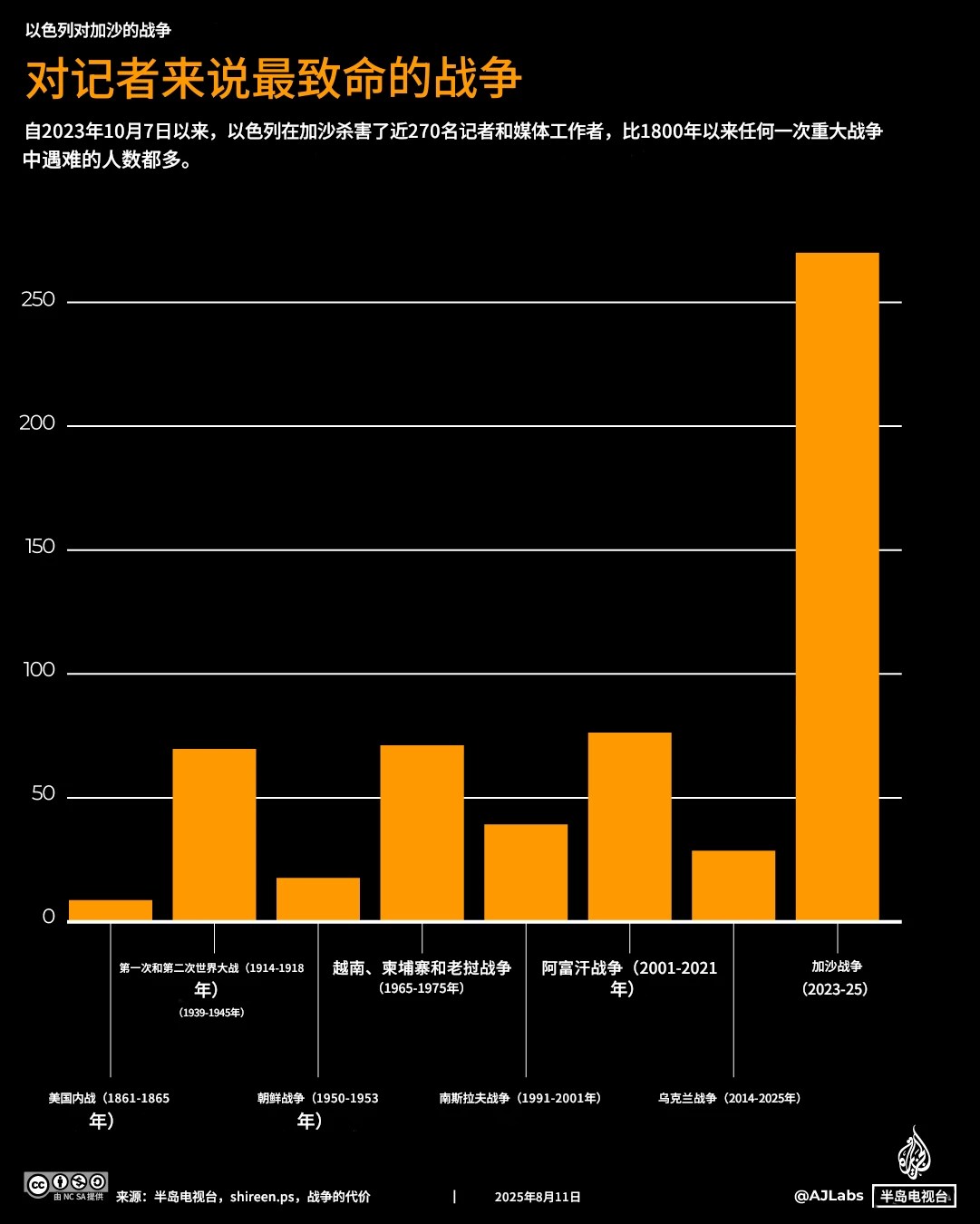 布朗大学“战争成本”项目报告称,在加沙遇害的记者人数超过了美国内战、第一次和第二次世界大战、朝鲜战争、越南战争、南斯拉夫冲突以及“911”事件后阿富汗战争期间的总和。