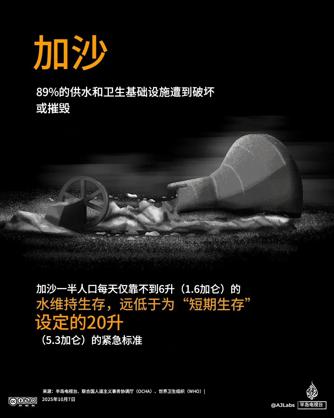 如今,加沙近一半人口每天饮用和烹饪用水不足6升(1.6加仑),28%的人口每天仅能获得不足9升(2.4加仑)的卫生和清洁用水——远低于紧急状态下为“短期生存”设定的20升(5.3加仑)的标准。