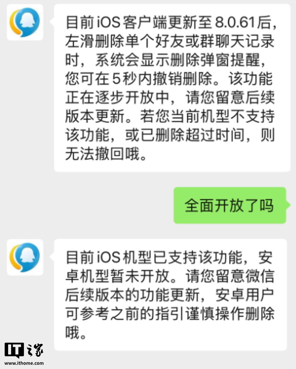 对此,腾讯客服表示,这是微信为了防止误操作而提供的功能。左滑删除单个好友或群聊天记录时,系统会显示删除弹窗提醒,用户可以在 5 秒内撤销删除,相应功能目前尚未全面开放,iOS 设备已更新至 8.0.61 及以上版本的部分机型支持,其他设备暂未开放。