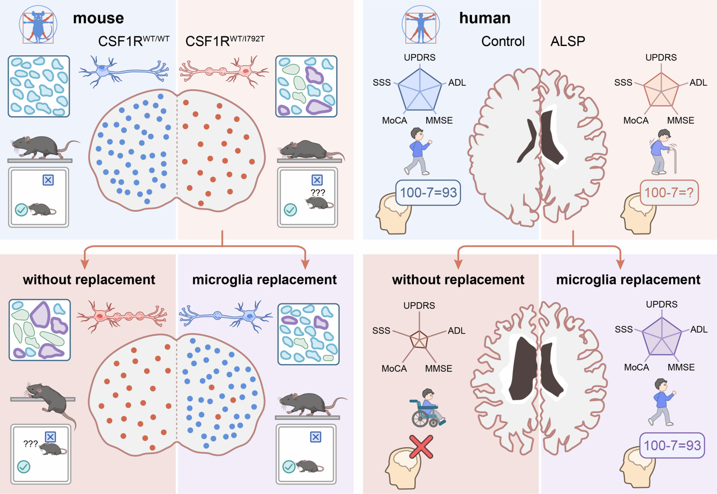 该研究首次证实通过替换中枢神经系统中的致病性小胶质细胞,成功阻断致命成人起病轴突膨胀伴色素胶质细胞脑白质病(ALSP)的病程进展,并首次在人类 ALSP 患者中系统性验证了小胶质细胞替换策略的临床可行性与长期疗效。