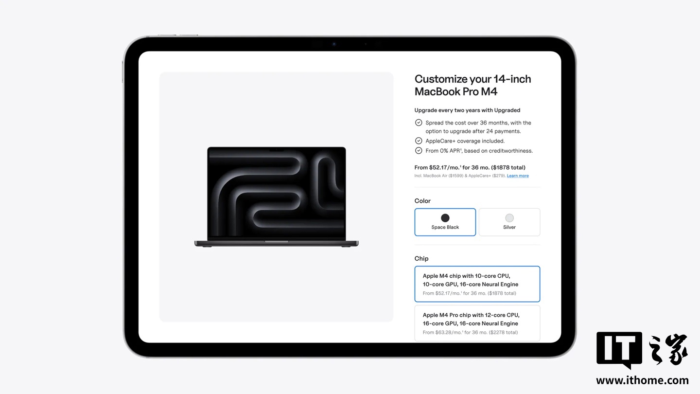 据介绍,相应计划主要就是将 MacBook 系列产品分期为 36 期,其中 MacBook Air 每月使用费用 33.28 美元(IT之家注:现汇率约合 239 元人民币)起、MacBook Pro 每月使用费用为 52.17 美元(现汇率约合 374 元人民币)起,用户在分期 2 年(完成 24 期)后即可将自己的设备免费升级至最新款 MacBook,开启新一轮 36 期付款周期,或继续支付剩余的 12 期费用,永久买断手中的产品。