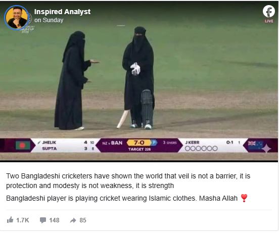 照片显示两名戴面纱的女运动员在板球场内,照片底部出现了一条比赛信息栏,与官方电视台的画面一致,显示孟加拉国队在三局过后以7分不败战绩战胜新西兰队。