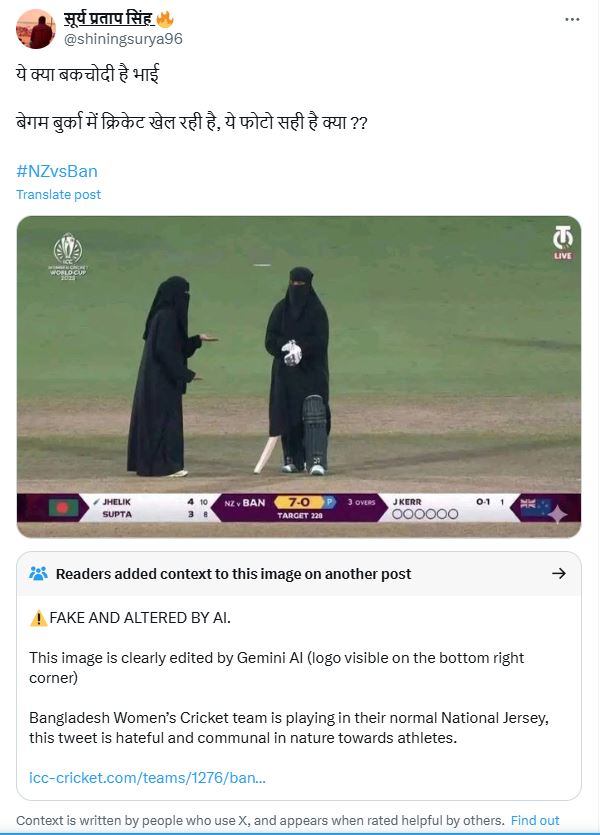 通过对孟加拉国板球队官方X账号上发布的材料进行视觉分析,我们未发现任何提及该图片的内容,也未发现任何球员佩戴面纱,这进一步加深了人们对其真实性的怀疑。