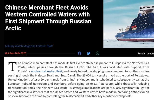 前不久因为波兰关闭边境,引发中欧铁路中断掀起的波澜,尚未完全平息,外媒又开始关注“伊斯坦布尔桥”号商船,从中国宁波启航,仅花费20天就抵达英国,创造多项纪录的行动。美国“Military Watch”网站对此的评价是,“中国商船首次避开西方控制海域,在俄罗斯的协助下打通中欧航线”。
