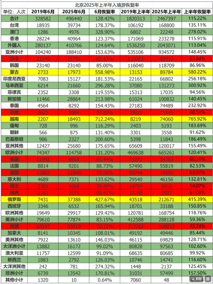 据北京市文旅局统计,截至今年6月,美国入境恢复率仅45.24%,德国恢复56.19%,英国57.9%,法国也只有53%左右。