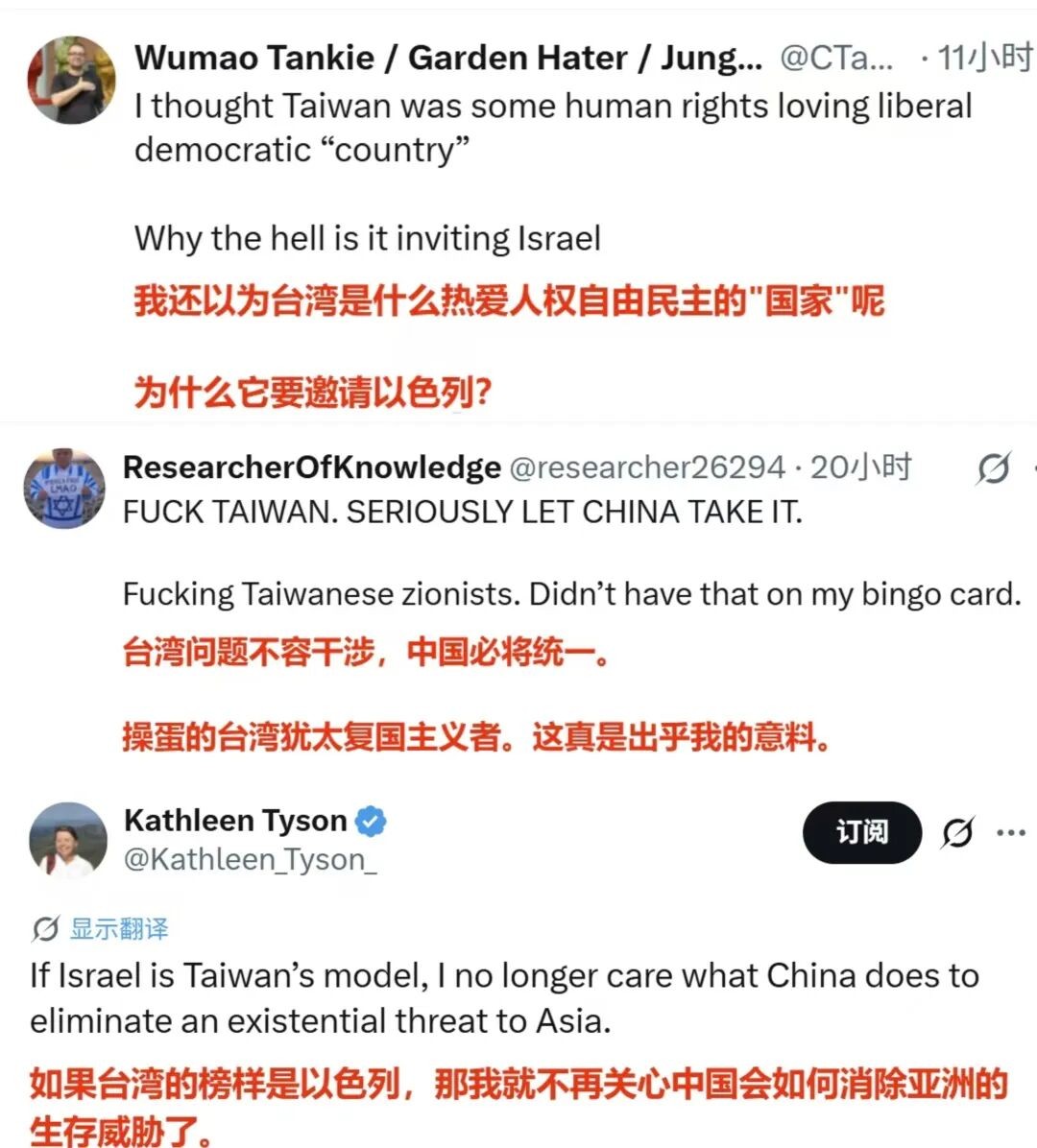 ·“我还以为台湾是什么热爱人权自由民主的‘国家’呢,为什么它要邀请以色列?”