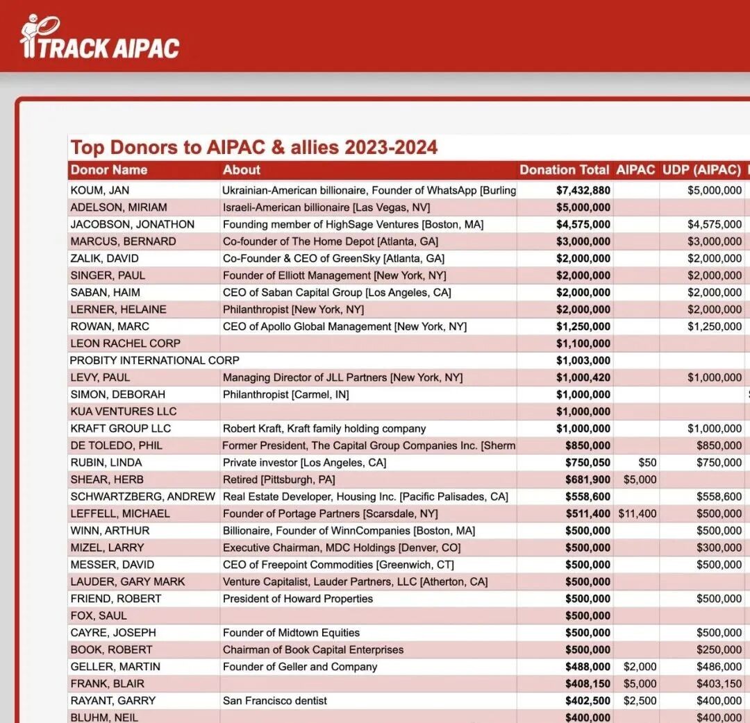 《纽约时报》形容AIPAC是“美国中东政策的塑造者”,每年都要花大价钱收买美国政客的身边人,在每个国会议员的身边布置5到15个“关键联系人”,利用他们影响政客立场、吸引政客支持以色列。至于钱从哪来?仅从公开渠道可查询的数据,美国的亿万富翁和大企业就为AIPAC捐助了至少7576万美元。简而言之,这个团体就是实质上的以色列驻美利坚合众国总督府。