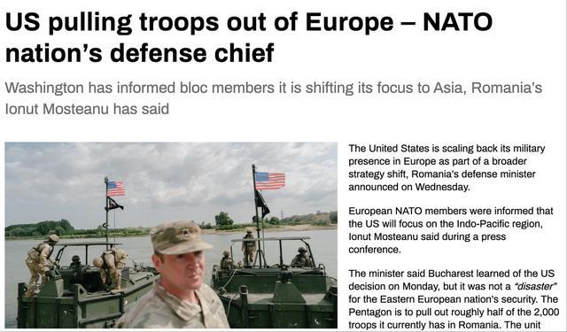 据《俄罗斯RT》10月29日报道,罗马尼亚国防部长莫什特亚努在新闻发布会上透露,美国已正式通知,将从欧洲逐步撤军,并把战略重心转向印太地区。