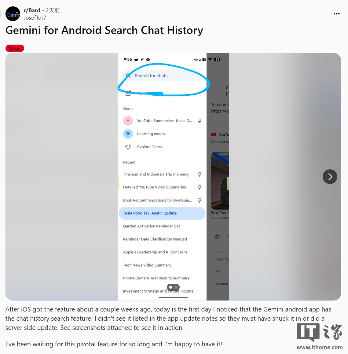 IT之家 7 月 14 日消息,科技媒体 9To5Google 上周(当地时间 7 月 11 日)发文,曝光了安卓版谷歌 Gemini AI 助手正在灰度测试“聊天历史记录搜索”功能,可更加便捷地找到用户需要的聊天历史记录。