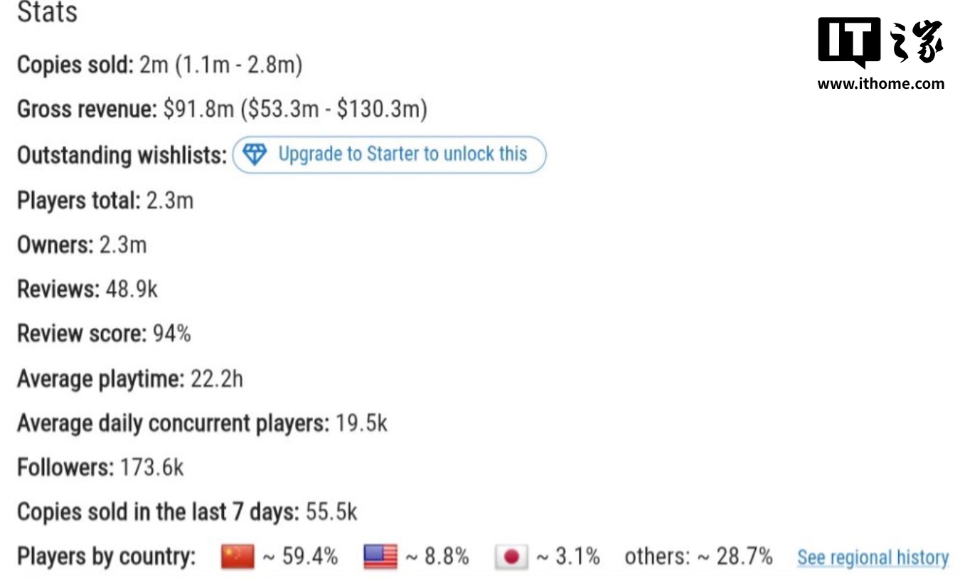 IT之家 7 月 14 日消息,第三方 Gemalytic 数据显示,《剑星》PC 版发售一个月,Steam 版销量已超 200 万套,营收 9180 万美元(IT之家注:现汇率约合 6.59 亿元人民币),玩家平均游玩时长达 22.2 小时。