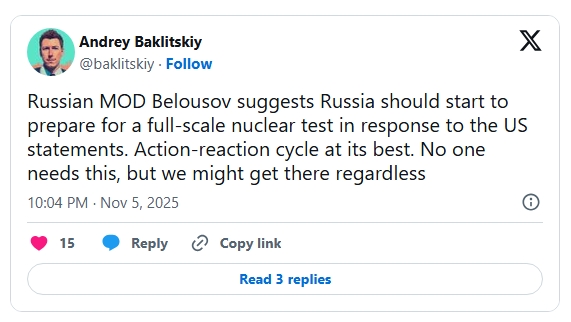 翻译:俄罗斯国防部的别洛乌索夫建议俄罗斯应该开始准备全面核试验,以回应美国的声明。行动-反应循环最典型的例子。没有人需要这种情况,但我们可能无论如何都会走到这一步。