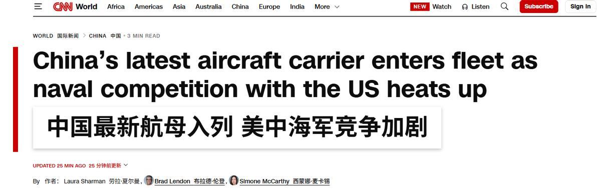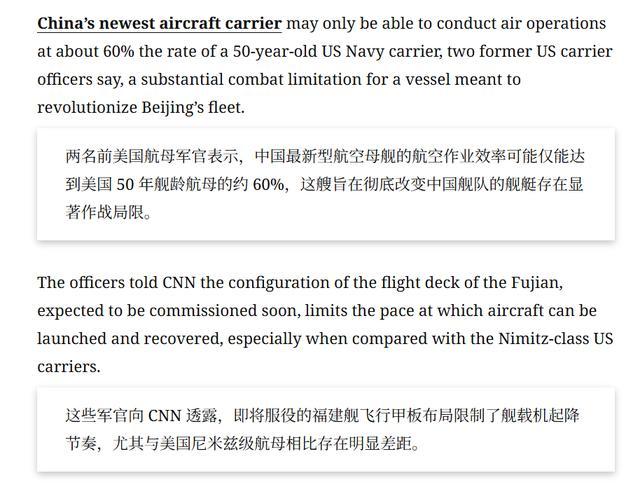 福建舰入列的新闻刚发布一个小时,CNN就等不及了,紧接着就把提前写好的稿子添个开头发出来了(其实我经常也是)。开头先是简单恭维一下中国新航母进展快进步大,但是紧接着就是早就准备好的专家访谈内容。