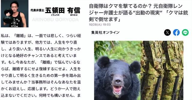 随后,日本一名律师提出了一个新的方案:既然不能用枪猎熊,那自卫队完全可以和熊拼刺刀嘛!对于这个看起来非常离谱的方案,很多网友都对此开始了口诛笔伐:你这么有本事,你自己怎么不去和熊拼刺刀啊?还有人开始“深挖”这位律师的履历。