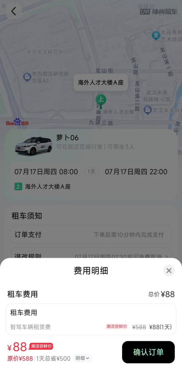 IT之家 7 月 15 日消息,极果网今日报道称,萝卜快跑在武汉推出包天服务,每天仅需 88 元,无需驾照就能开走。