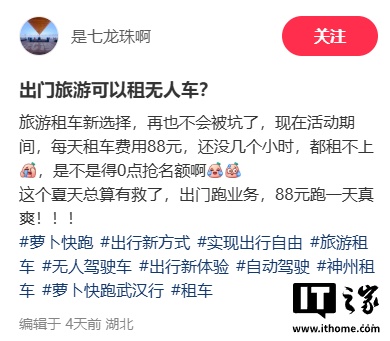 IT之家注意到,小红书等平台上周就已经有部分用户体验到了萝卜快跑的包天服务。