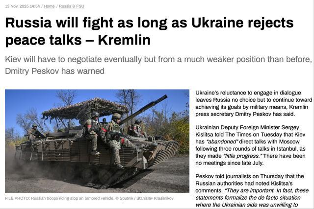 据《俄罗斯RT》11月13日报道,克里姆林宫发言人佩斯科夫表示,只要基辅拒绝对话,俄罗斯就别无选择,只能继续通过军事手段实现其目标。他警告称,乌克兰最终仍将不得不回到谈判桌,但到那时其处境将比此前弱得多。