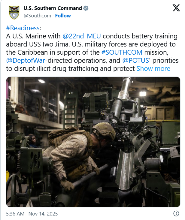 美国南方司令部在社交媒体上发文称,美国海军陆战队正在加勒比海的“硫磺岛”号两栖攻击舰上进行炮兵训练,以支持美国总统唐纳德·特朗普“打击非法毒品贩运和保护国土安全”的优先事项。