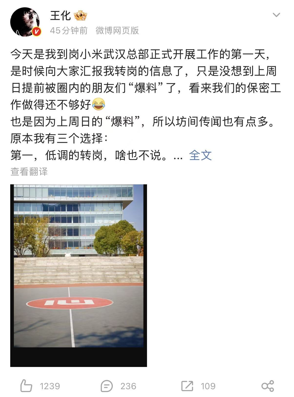 11月21日,王化在社交平台发文称,今天是其到岗小米武汉总部正式开展工作的第一天,是时候向大家汇报其转岗信息。“轮岗制度的规则里面,三年就该轮岗,五年是必须轮岗。所以我轮岗的时间点是五年前就定下来了;岗位有几个选择,武汉是我选的。”