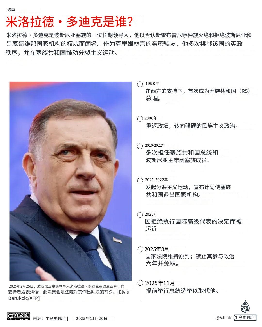波斯尼亚和黑塞哥维那塞族共和国(塞族占多数的实体)周日举行总统选举,这是在选举当局于8月剥夺了分离主义波斯尼亚塞族领导人米洛拉德·多迪克的总统职务后提前举行的。