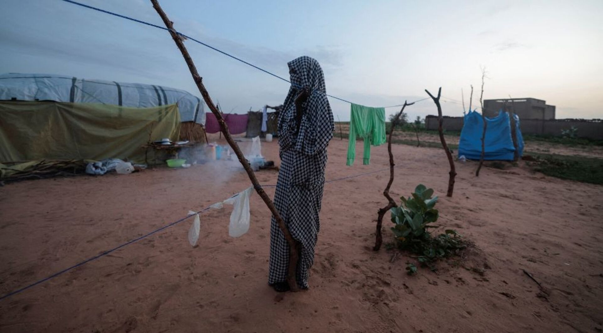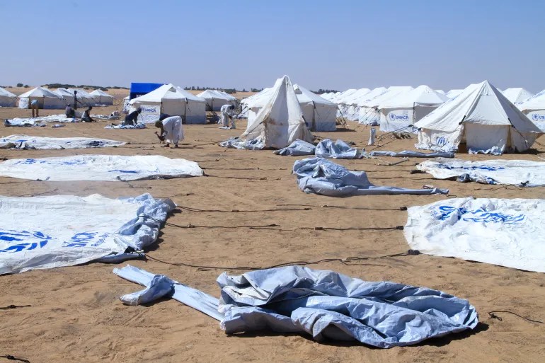 2025年11月20日,在苏丹北部达巴镇的阿法德难民营,苏丹志愿者正在为逃离法希尔的人们准备帐篷(法新社)