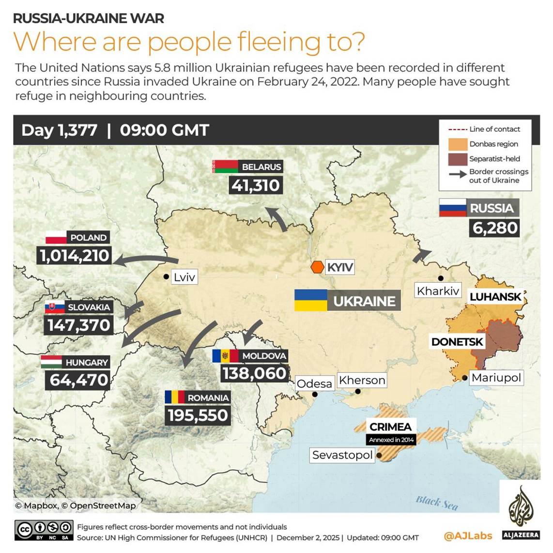 联合国表示,自2022年2月24日俄乌战争爆发以来,各国已记录580万乌克兰难民。许多人选择在邻国寻求庇护(半岛电视台)