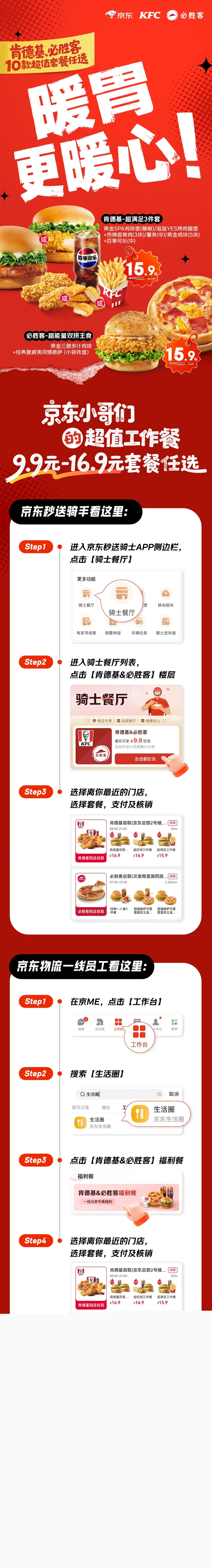 京东宣布,联合百胜集团推出全新福利,为外卖与物流一线员工送上实惠工作餐。只要15.9元即可拿下肯德基超满足三件套,9.9元起还能从10款肯德基、必胜客套餐中任选。