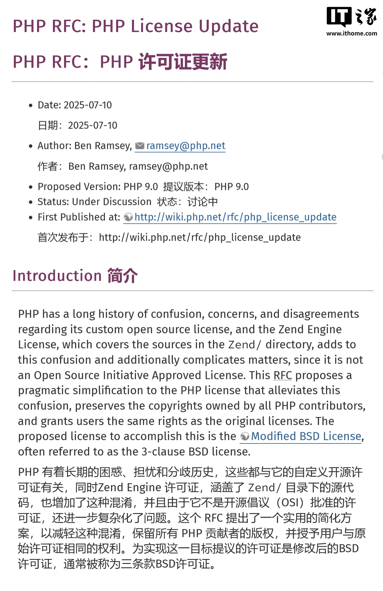PHP 社区知名人士 Ben Ramsey 提出了一项新的 RFC 提案,建议将 PHP 和 Zend 引擎的许可更新为 Modified BSD License 许可,从 PHP 9.0 开始采用。