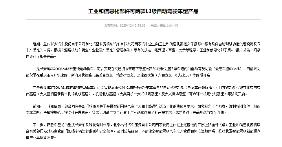 在智能驾驶跨越式前进的恢弘叙事下,L2终于有了向L3实质性跃迁的动向。12月15日,长安牌SC7000AAARBEV型纯电动轿车(长安深蓝SL03)、极狐牌BJ7001A61NBEV型纯电动轿车(北汽极狐阿尔法S6)成为首批入选L3级有条件自动驾驶准入许可的产品。