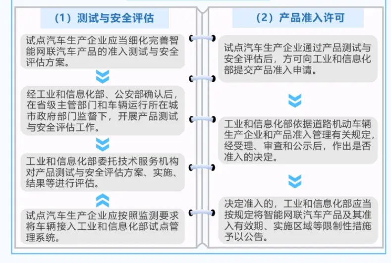 按照流程,第二阶段是产品准入试点,汽车生产企业“应当细化完善智能网联汽车产品的准入测试与安全评估方案”。