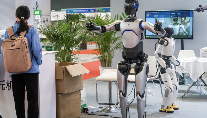 2025年10月22日,广东广州,大湾区国际具身智能机器人产业大会上,智元机器人展台展出多款人形机器人,吸引参观者。图片来源:CFP