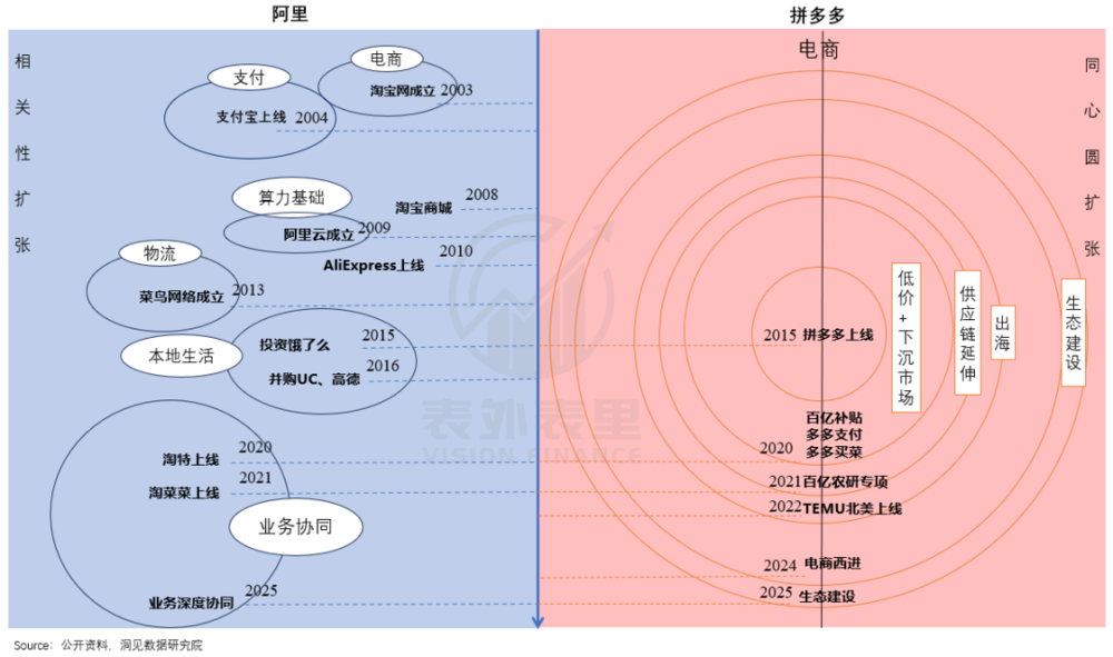 不同路径背后,是阿里与拼多多有自己的“求进哲学”:前者是从电商向外的“相关性扩张”,后者是以电商为焦点的“同心圆扩张”。