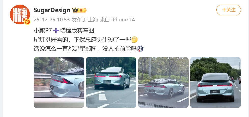 博主“SugarDesign”发布了一组小鹏P7+增程版的实车图,新车预计2026年正式发布。与现款小鹏P7+相比,新车采用了全新的设计风格,搭配淡蓝色车漆,尾部造型更显时尚动感。