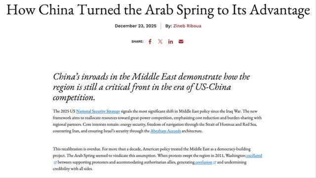 文章明确指出,2025年的美国《国家安全战略》被迫通过大国竞争的视角重新审视中东,这意味着美国已经放弃了将该地区改造成美式民主样板房的幻想。