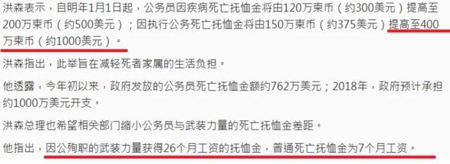在《柬中时报》 2017年10月10日的报道当中,揭露了柬埔寨的国家抚恤标准:“(柬埔寨)公务人员,因执行公务死亡,抚恤金为400万柬币(约1000美元,即7000人民币)。”而柬埔寨军人的抚恤标准则是这样的“因公殉职的武装力量(成员)获得26个月工资的抚恤金,普通死亡抚恤金为7个月工资。”