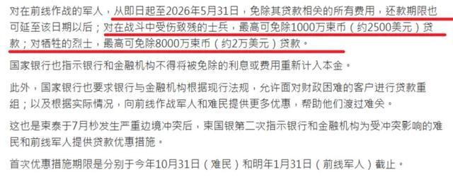 “对在前线作战的军人,从即日起至2026年5月31日,免除其贷款相关的所有费用,还款期限也可延至该日期以后;对在战斗中受伤致残的士兵,最高可免除1000万柬币(约2500美元)贷款;对牺牲的烈士,最高可免除8000万柬币(约2万美元)贷款。