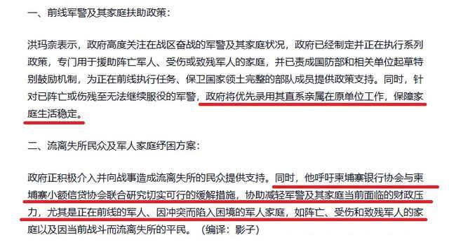 首先是2025年7月30日【柬埔寨头条综合】的一篇报道《洪玛奈公布前线军警及其家庭援助机制》在这篇报道里,柬埔寨官方明确承诺为前线士兵提供的支持为:1、阵亡士兵直系家属可以进入原军警单位继续服役,2、呼吁柬埔寨金融及银行业给前线士兵免除一定贷款……