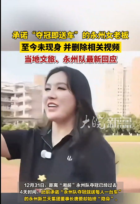据媒体此前报道,2025年12月27日,2025年湘超总决赛落下帷幕,永州队最终夺得冠军。这本该是一场皆大欢喜的体育盛事,然而赛后却因永州新兰天集团董事长唐蕾的一则承诺,引发了外界广泛关注。